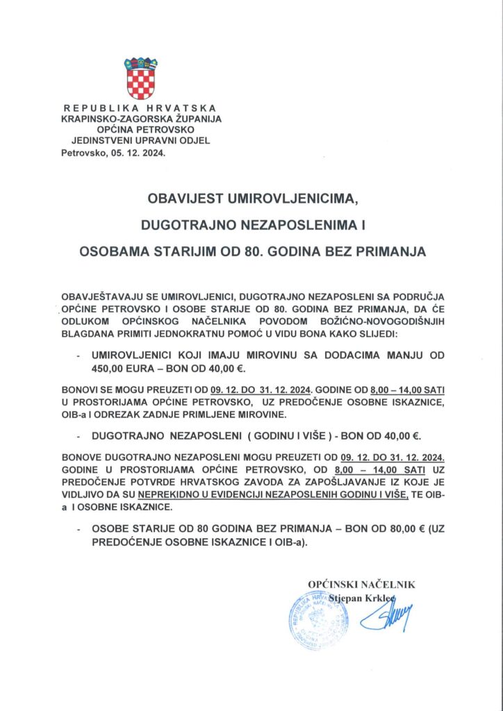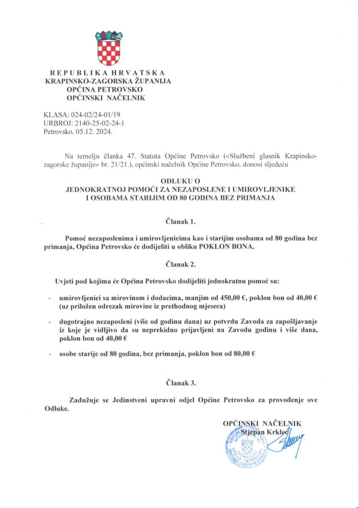 Jednokratna pomoć za dugotrajno nezaposlene, umirovljenike i osobe starije od 80 godina bez primanja