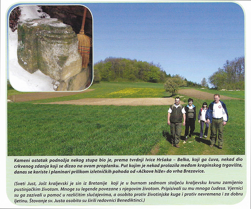 U pisanim izvorima prvi opis kapele sv. Justa, koja je sagrađena na obroncima Brezovice, potječe iz 1661. godine. Uzgredno spominjanje njezina naziva pronalazimo u pisanim izvorima nešto ranije. Naime, 1590. godine, zbog stalnih svađa oko točnosti granica krapinskog trgovišta, prišlo se njihovom utvrđivanju. Pouzdanici zagrebačkog Kaptola, koji su bili određeni za taj posao, sazovu svjedoke, njih 27, kako bi se utvrdile točne međe. O tom utvrđivanju granica krapinskog trgovišta dr. Stjepan Ortner piše: «Prvi je bio saslušan svjedok Gjuro Oderjan iz Pristave. Bijaše kmet crkve sv. Nikole, starac od 60 godina. Kako je pobirao crkvenu desetinu u trgovištu i kotaru krapinskom, dobro je poznavao dokle sežu i međe njegove. Ove je međe opisao Oderjan ovako: