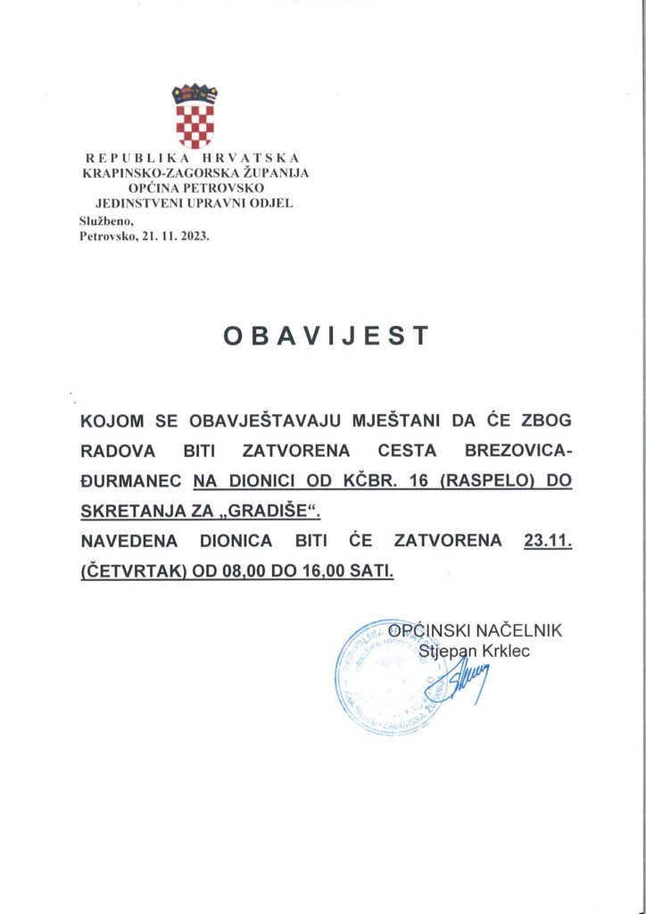 OBAVIJEST – ZATVORENA CESTA BREZOVICA­ ĐURMANEC 23.11.2023. (od 08-16 sati)