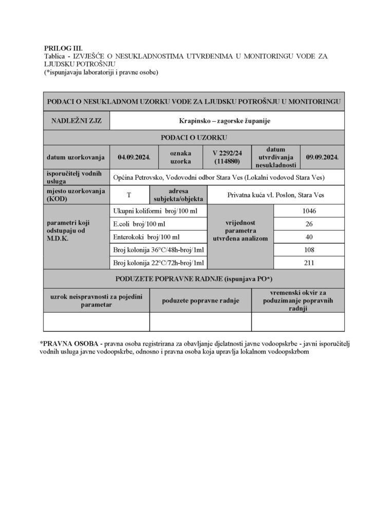 Vodovodni odbor Stara Ves (Lokalni vodovod Stara Ves) – IZVJEŠĆE O NESUKLADNOSTIMA UTVRĐENIMA U MONITORINGU VODE ZA LJUDSKU POTROŠNJU